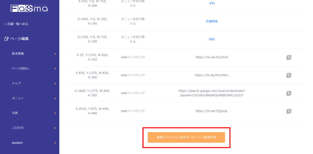 ④ 画面の一番下にある「座標とアクション設定をコピーして新規作成」をクリックします。