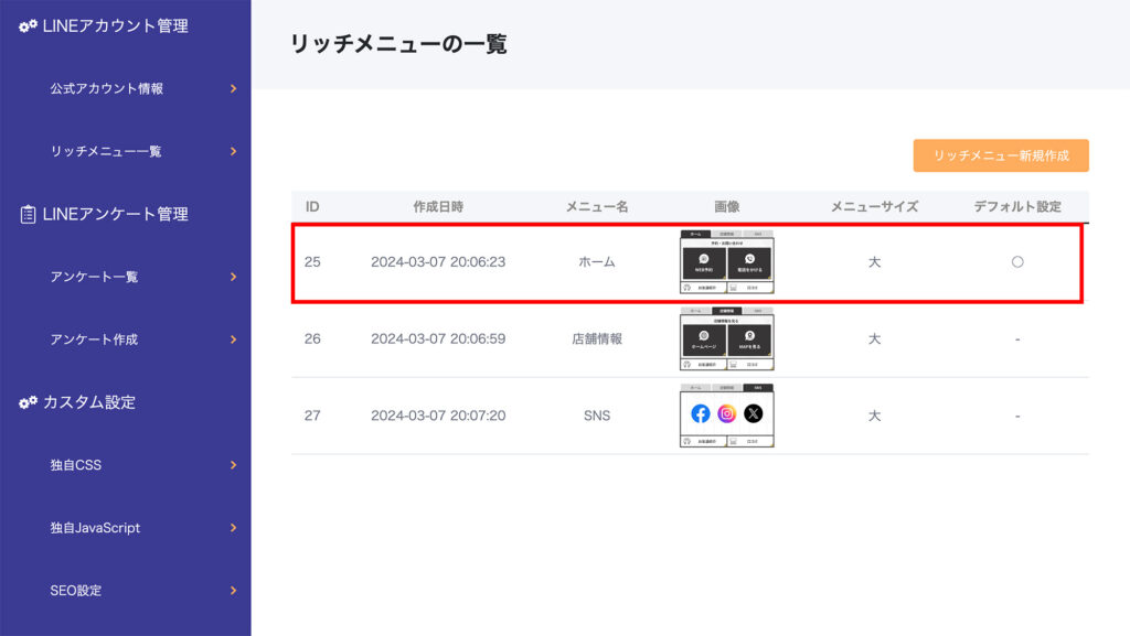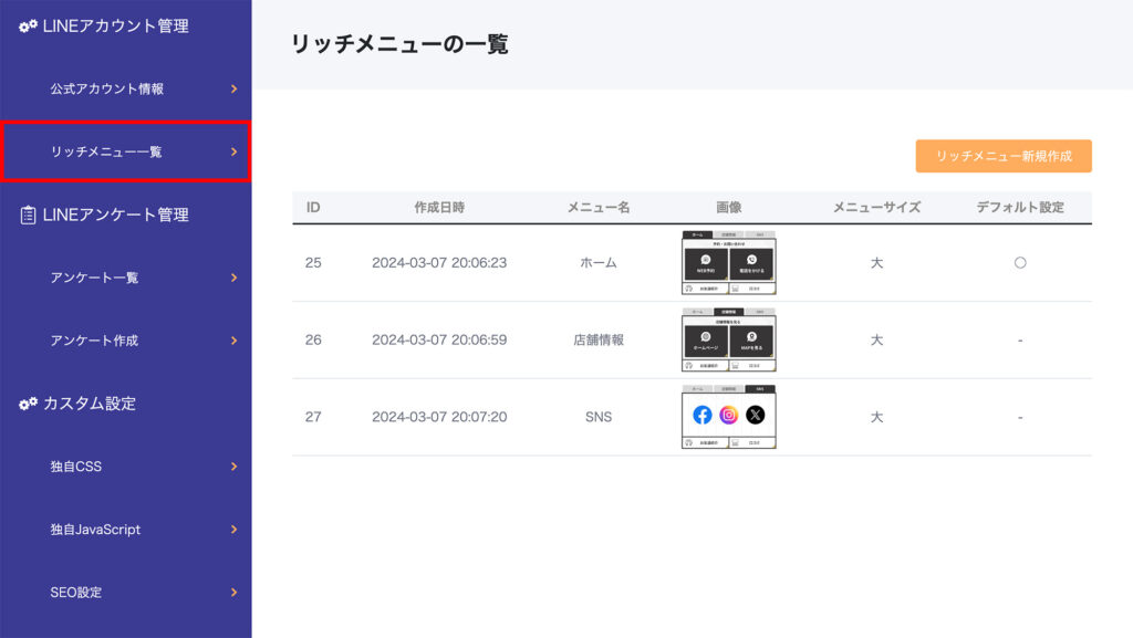 ② すでに設定されているリッチメニューの一覧が表示されます。