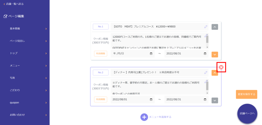 ・削除する場合はセクション右上にカーソルを合わせて✕印をクリックします。