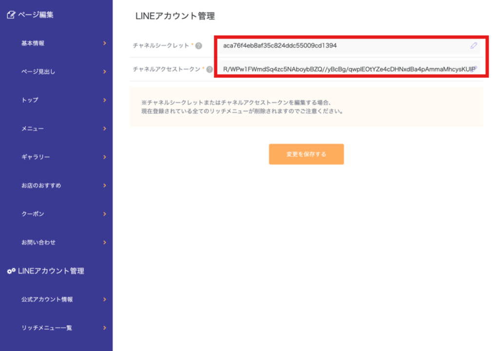 ③ コピーしておいた「チャネルシークレット」と「チャネルアクセストークン」をペーストする