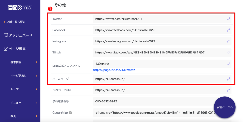 ❶「基本情報」の「その他」セクションでお店のSNSのリンク先URLを設定します。