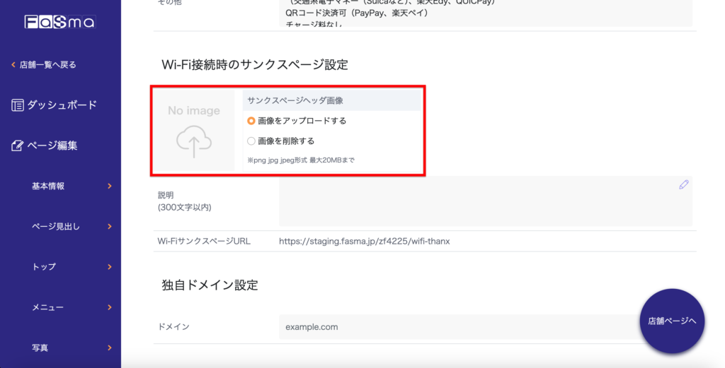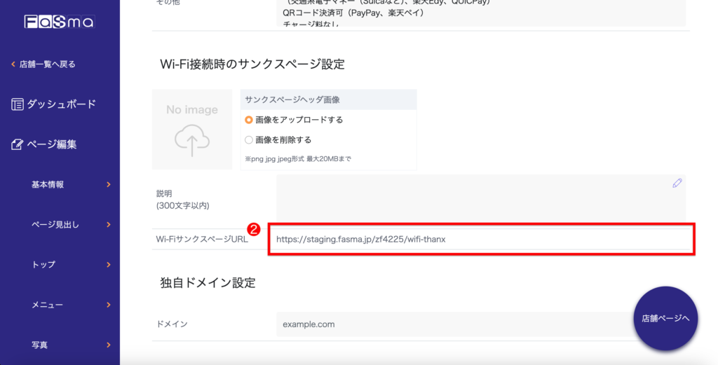 ❷「Wi-FiサンクスページURL」からサンクスページが確認できます(こちらのURLをWiFi接続時のURLに指定してください)。