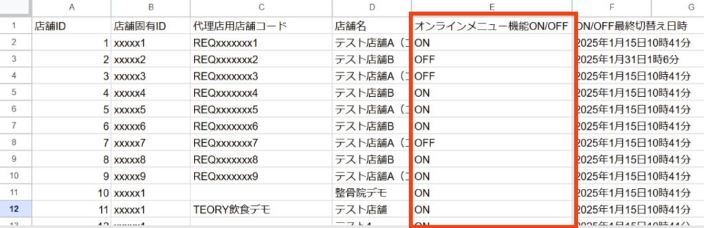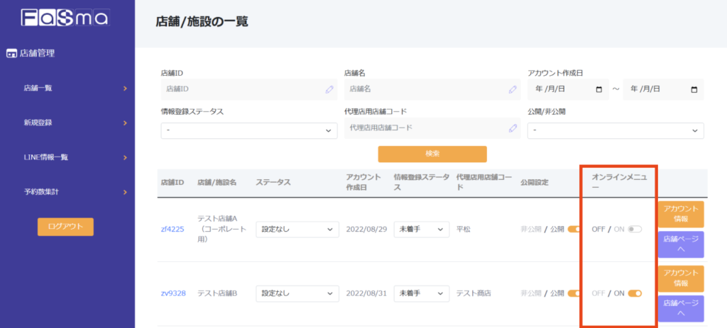 一部のアカウントを除き、店舗一覧画面からON/OFFを切り替えることができます。