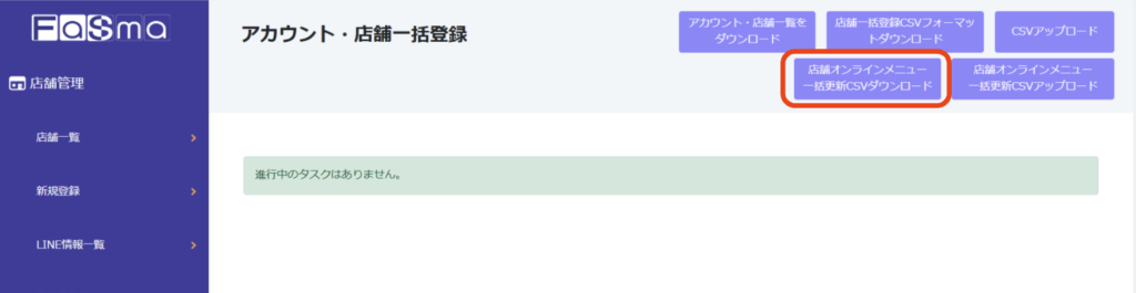 https://hbcms.jp/account-csv/registration から「店舗オンラインメニュー一括更新CSVダウンロード」をクリックする。