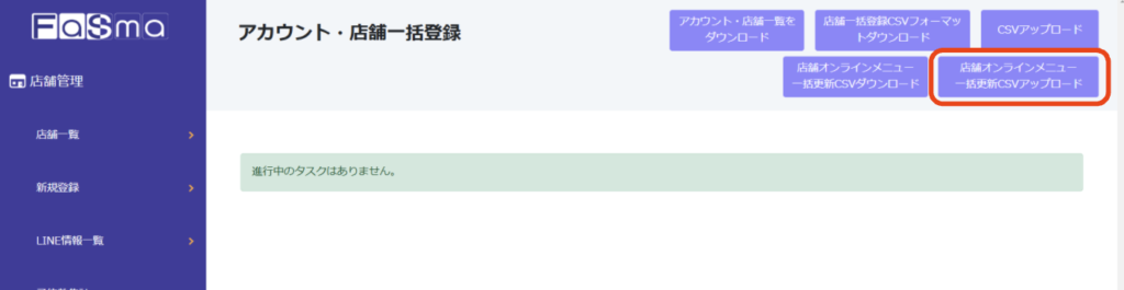 「店舗オンラインメニュー一括更新CSVアップロード」をクリックし、①で書き換えたCSVをアップロードしてください。
