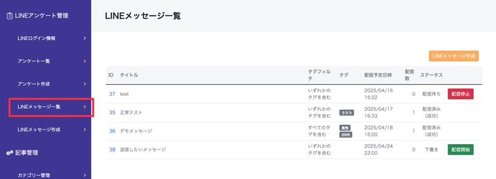 ①左メニューの「LINEアンケート管理」>「LINメッセージ一覧」を選択