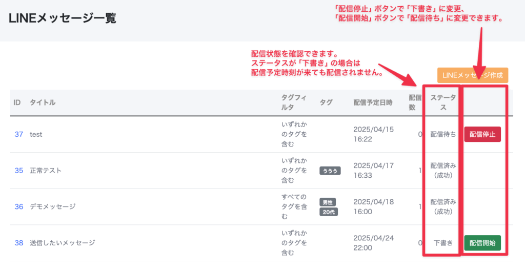 ⚠️ すでに配信予定日時を過ぎている「下書き」のメッセージを「配信待ち」に変更した場合は、即時配信されますのでご注意ください。